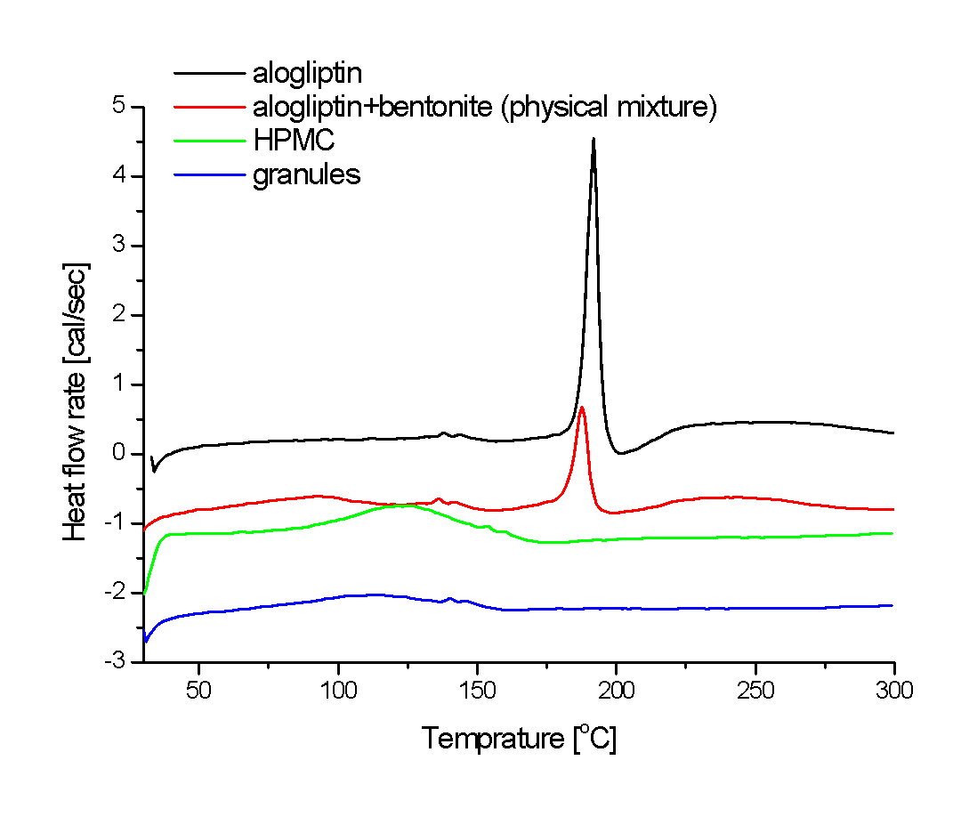 However, the thermogram of alogliptin in the physical mixture of alogliptin and bentonite did not show any change in comparison to the thermogram of pure alogliptin. Hence, there is no interaction between bentonite and alogliptin. Moreover, the peak of alogliptin did not appears in the thermogram of the granules, which may be related to the low content of the drug.