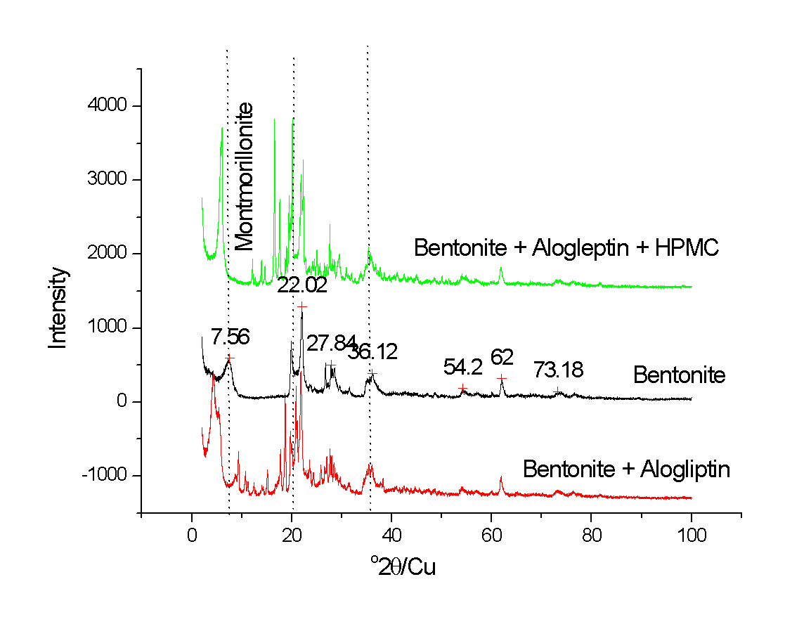 Fig. 4: XRD patterns of bentonite, bentonite-alogliptin granules and bentonite-alogliptin-HPMC mixture (granules with HPMC (20%))