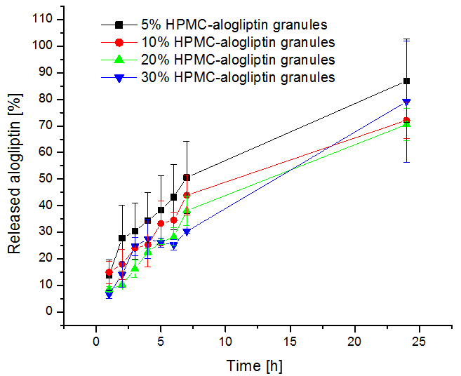 Fig. 6: Dissolution profiles of alogliptin from 5, 10, 20 and 30% HPMC bentonite tablet (mean±SD, n=3)