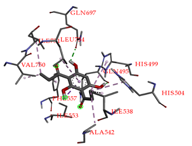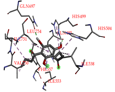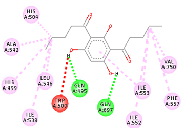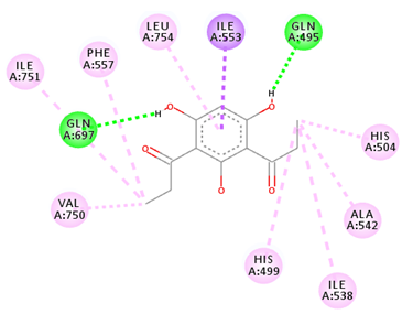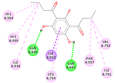 Docking results showed that the hydroxyl group on the phloroglucinol moiety of derivative 2 (fig. 2) formed 2 important hydrogen bonds with the surrounding amino acid residues Gln495 (O–H—O–H) and Gln697 (O–H—O–H) with a distance of 1.96 Å and 1.94 Å, respectively. The benzene ring of the phloroglucinol moiety, formed a π–sigma bond with Ile553 with a distance of 3.92 Å, and interacts with Leu 754 through π–alkyl interaction, with a distance of 3.92 Å. Both the acyl side chains on the benzene ring were also stabilized through hydrophobic interactions with His504 (3.91 Å), His 499 (4.48 Å), Ile538 (5.42 Å), Phe557 (4.69 Å), Ile751 (4.83 Å), and Val750 (4.14 Å).