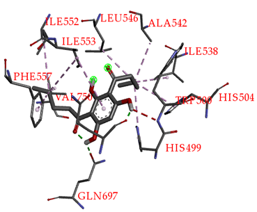 Similarly, the hydroxyl group on the benzene ring of derivative 4 (fig. 3) also formed 1.88 Å and 2.00 Å hydrogen bonds (O–H—O–H) with the same amino residues, Gln495 and Gln697. An unfavorable binding interaction detected between the hydroxyl group on the benzene ring and the nitrogen atom of Trp500 (O–H—N–H) with a distance of 2.56 Å. The terminal end of the acyl chain formed van der Waals force with an amino residue, Ile553 (H–C—C–H) with a distance of 5.26 Å. Derivative 4 has comparative binding energy with the most active tHGA analogue (table 1). Derivative 4 has shorter side chains, consisting of two 5-Cs acyl side chains, while the latter consisted of one 5-Cs acyl group and one geranyl group. Derivatives 2 and 4 have hydrophobic interaction with the same amino acid residues, His504 (4.43 Å), His499 (5.38 Å), Ile538 (4.96 Å), Phe557 (4.74 Å) and Val750 (8.95 Å). Other residues involved in hydrophobic binding were Ala542 (4.06 Å), Leu546 (4.52 Å) and Ile552 (5.10 Å).
