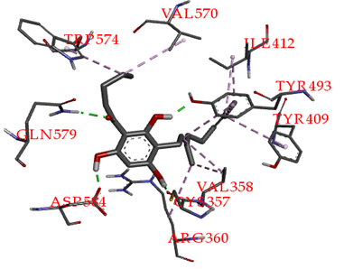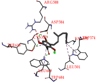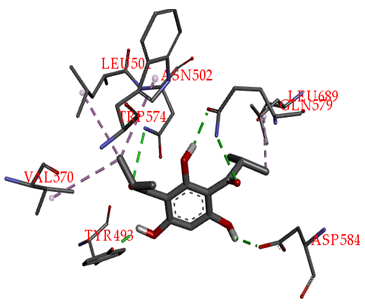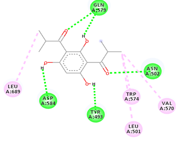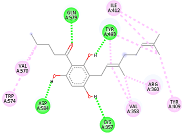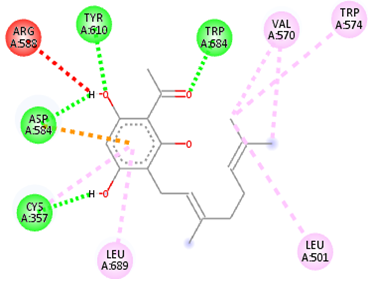 Binding interactions observed for tHGA (fig. 6) and the most active tHGA analogue (fig. 7) were very similar. For example, both compounds are stabilized through similar hydrophobic binding interactions with amino acid residues Val570 and Trp574. Furthermore, the hydroxyl and acyl groups of both compounds showed hydrogen bondings with amino acid residues Asp584 and Cys357. On the other hand, tHGA formed unfavorable bonding interaction, with a distance of 2.69 Å, between the hydroxyl group on phloroglucinol moiety with the amino acid residue Asp588 (O–H—H–N).