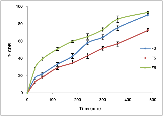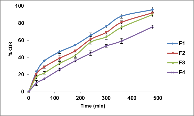 In vitro release of all formulation were performed and results are shown in fig. 2 and 3. The maximum percentage of drug released from the formulations F1 to F4 was found to be 95.88±3.03, 92.29±2.72, 90.18±2.59, and 75.88±2.43 at the end of 480 min. It was found that increase in the concentration of polymer significantly decreased the drug release. The slow drug release mechanism for higher polymer concentration can be explained by the reduction in permeability due to change in the morphology of the polymer. Improved polymer concentration may have providing the matrix with greater tortuosity and deprived water porosity for diffusion of drug [20,21]. In vitro release of drug also depends on nature of plasticizer. As the concentration of hydrophilic plasticizer was increased, the release of drug was also found to be increased, asshown in fig. 2. It may be due to quick absorption of water by formation of large number of hydrogen bonds and helped in faster diffusion of drug from the system. Formulation F5, F3 and F6 were contained different concentrations of plasticizer i.e. 20, 30 and 40 % respectively and maximum drug release at the end of 480 min was found to be 62.15±2.39, 90.18±2.59 and 93.18±1.19 respectively.