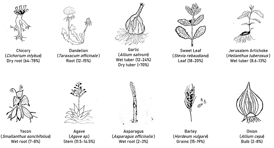 Inulin and Oligofructose, which is widely available on the market for industrial food products, is either synthesized from sucrose or derived from chicory roots. Large variety of plants naturally contains inulin [9]. Jerusalem artichoke and dahlia are reported as strong sources of industrial production in temperate regions [10]. Among all the parts, the root parts of various plant sources are rich in inulin and used for extraction. Inulin manufacturing resembles the process of sugar extraction. Initially, the roots are harvested, sliced, and washed. Followed by a hot water diffusion process, then purified and dried. A high-performance (HP) type of inulin is noted as a recent advancement in the production of inulin. By eliminating the shorter-chain molecules, this substance is manufactured. This results in the elimination of both the residual sugars and oligomers. With no sweetness contribution, HP inulin has almost twice the fat mimetic properties of normal inulin.