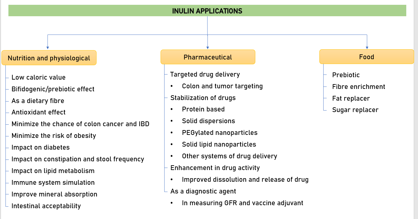 Inulin does not only enhance the food flavor but also has different physiological functions, like reducing blood sugar and fat, including cholesterol and triglycerides. It is also used for constipation, diarrhea, diabetes, and as an anticancer [2]. Recent advances of inulin in the pharmaceutical field include colon-targeted drug delivery, as the inulin can only be hydrolyzed by the specific enzymes in the colon. It allows the growth of micro-flora, the good bacteria in the gut. Inulin is considered as a prebiotic as it is fermented by bacteria that normalize the colon.