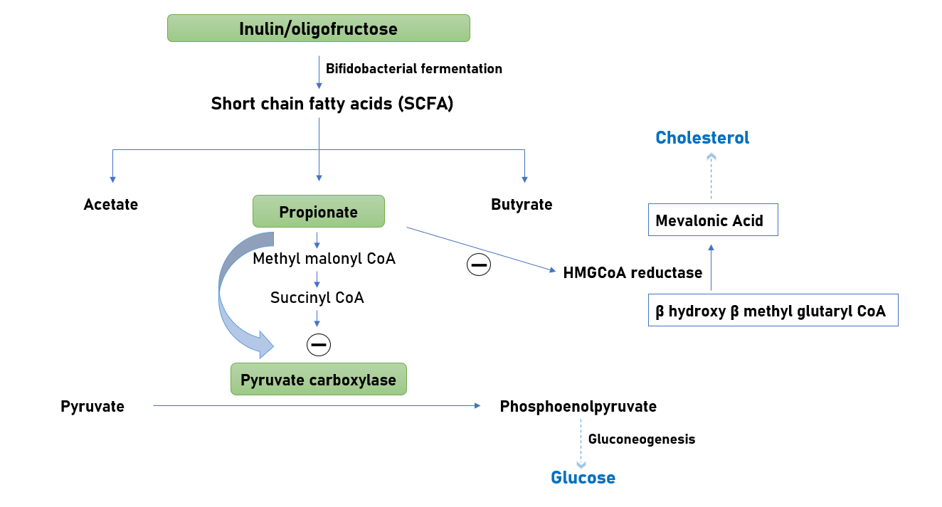 Lipid metabolism, in short, is known as the degradation of lipids in cells. Inulin’s nondigestible feature favours in reducing the risk of high concentrations of triacylglycerol. Inulin-derived oligofructose can significantly decrease triglycerides in both liver and serum, increase the ratios of lipoproteins, and also reduces cholesterol. The daily intake of 10 grams of inulin decreases the risk of atherosclerosis by lowering blood lipogenesis and triacylglycerol plasma concentrations. Various human studies show that inulin is more successful than oligofructose in reducing triglyceridemia. Several studies on rats, rodents proved the effect of inulin in reducing the production of genes that are responsible for the lipogenesis of an enzyme [34]. In addition, it can combat the accumulation of triacylglycerol in the liver and has beneficial effects on hepatic steatosis. The various mechanisms by which inulin influences the metabolism of lipids include: Elevated activity of the muscle LPL enzyme, increased production of satiogenic peptide and polyamine, increased ornithine decarboxylase activity, Increased Bifidobacteria population, and short-chain fatty acid (SCFA) production, etc. SCFAs are used as an energy source and appear to promote the health of the intestinal mucosa [35].