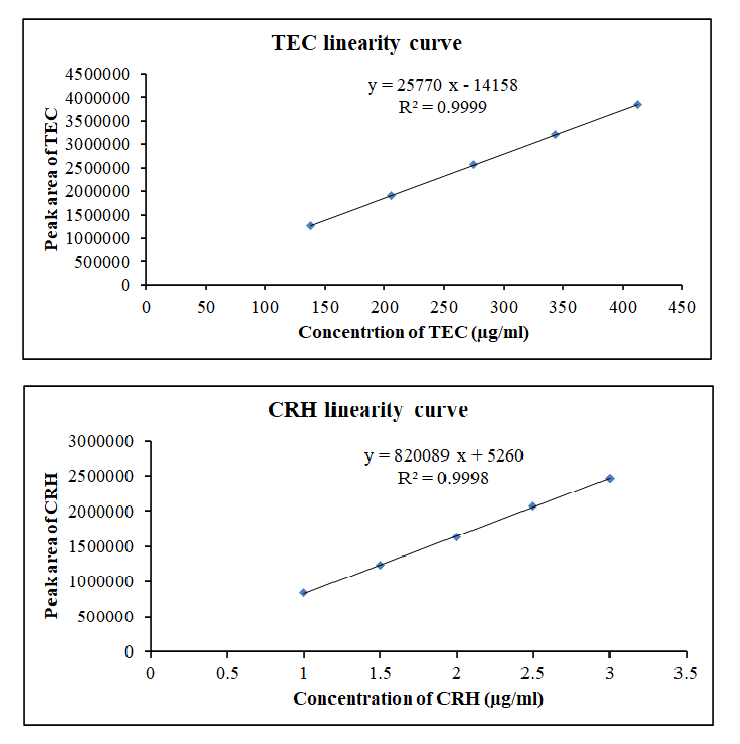 During this work, the linearity of area response was checked for both TEC and CRH. Chromatographed solutions with concentrations of 137.5-412.5 μg/ml for TEC and 1-3 μg/ml for CRH given linear peak response areas. The regression line equation, regression coefficient and TEC and CRH calibration curves are shown in fig. 2.