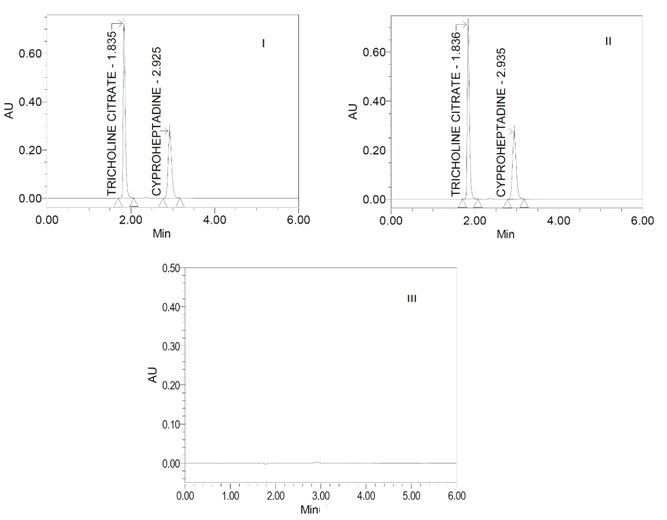 Fig. 3: Obtained chromatograms for (I) Cypro T sample (II) TEC an CRH solution (III) Blank