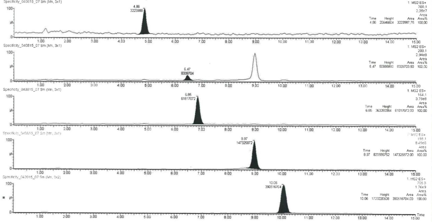 Specificity of the present LC-MS/MS method was checked by injecting the blank, four individual genotoxic impurities and Atazanavir sulfate sample and sample spiked with four genotoxic impurities. There was no interference of the main drug with impurities and the developed method was adequately resolved four genotoxic impurities with each other and with the main drug. Results presented in table 2 and representative spectra presented in fig. 3.