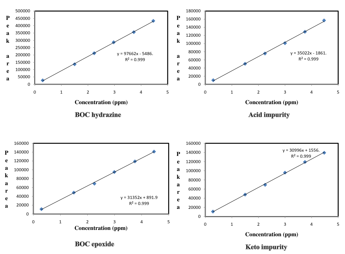 The linearity of the method in multiple reaction monitoring mode was satisfactorily demonstrated by injecting the four genotoxic impurities individually at different levels of concentrations ranges from LOQ (0.3 ppm) and 120% (4.5 ppm) of the specification concentration (3 ppm). The calibration curves were plotted between the peak areas and concentration of four genotoxic impurities at include 0.3, 1.5, 2.25, 3, and 4.5 ppm for LOQ, 40, 60, 80, 100, 120% specification levels, respectively.
