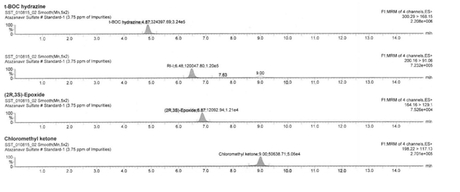 In the present study, we developed a simple LC-MS/MS method that can quantify (below 0.3 ppm) the BOC Hydrazine, BOC Epoxide, Acid impurity, and Keto impurity at a lower level in Atazanavir sulphate. Analysis was carried out with gradient mode and multiple reaction monitoring (MRM) method for the detection of stable fragments to improve the sensitivity. The MRM fragmentation shown in below mention below.