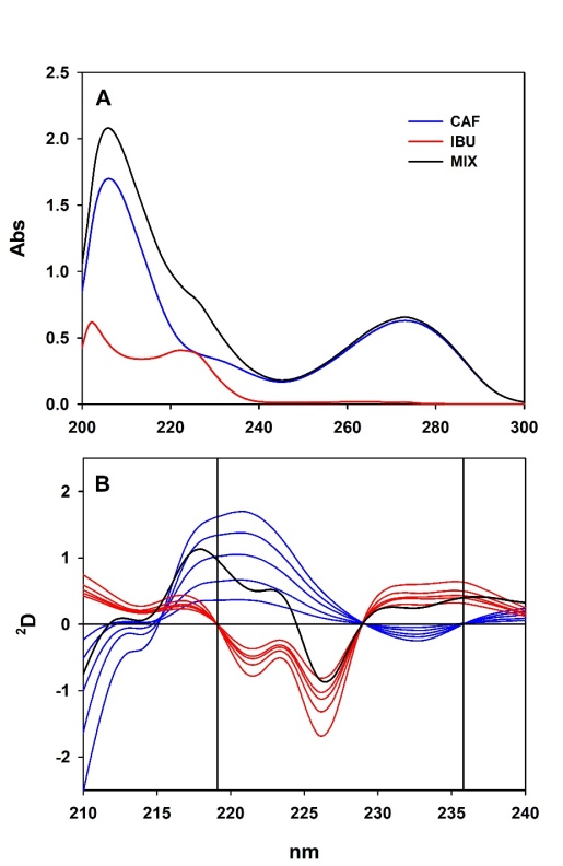 Fig. 2: (A) Zero-order spectra of a solution of ibuprofen (IBU) at 10 µg/ml, caffeine (CAF) at 15 µg/ml and a synthetic mixture of both drugs (MIX) at same concentrations. (B) Second-derivative (2D) of standard calibration curves and MIX solution. Vertical lines show the zero-crossing points used to quantify IBU (235.6 nm) and CAF (218.8 nm)