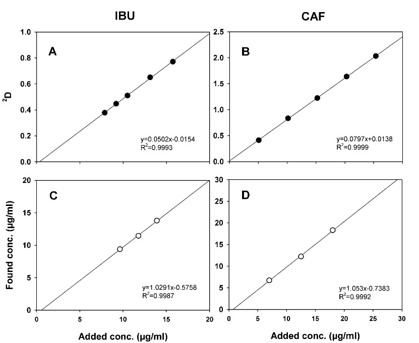 Of each drug, two standard solutions were prepared, and mean linear regression equations were as follows: y=0.0502x‒0.0154 for IBU and y=0.0797x+0.0138 for CAF. All standard calibration curves were significant (R2>0.999, *P<0.05). Plots are shown in fig. 3A and fig. 3B. The CI95% calculated for intercept was-0.044 to 0.013 for IBU and-0.014 to 0.041 for CAF. The %CV of response factor was 1.75% for IBU and 1.86% for CAF. The linear regression equations calculated to test accuracy were as follows: y=1.0291x‒0.5758 for IBU and y=1.053x‒0.7383 for CAF. All linear regressions were significant (R2>0.99, *P<0.05). Plots are shown in fig. 3C and fig. 3D. The CI95% for slopes and intercepts, respectively, were as follows: 0.56 to 1.49 and ‒6.10 to 4.95 for IBU and 0.66 to 1.44 and ‒5.91 to 4.43 for CAF. The %CV of recovery data were 0.58 to 0.99% for IBU and 0.34 to 1.76% for CAF. Results shown a good accuracy and precision of the proposed UV-derivative method.
