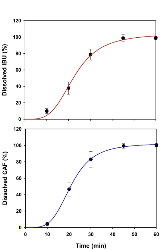Fig. 4: Dissolution profiles of ibuprofen (IBU) and caffeine (CAF) obtained with USP Apparatus 2 at 100 rpm and 900 ml of 0.1 M phosphate buffer pH 7.4 as dissolution medium. Mean value±standard deviation, n=12