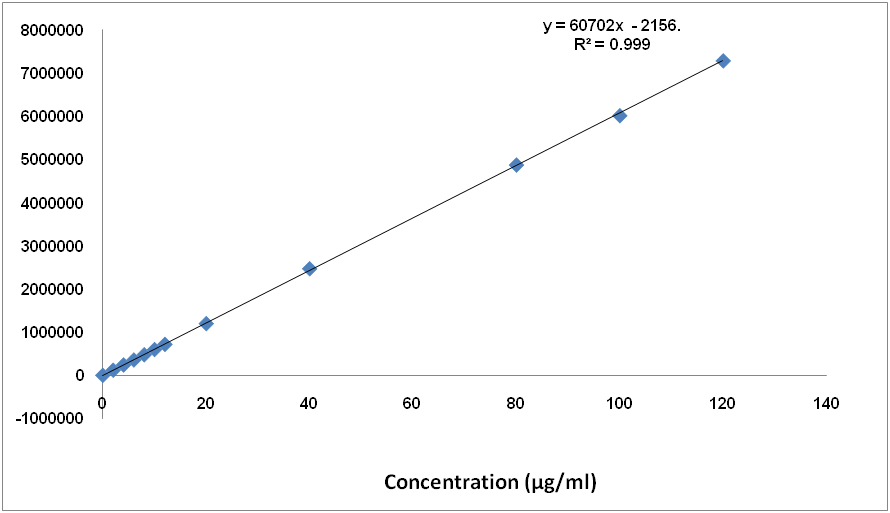 A series of solutions over the range of 2,4,6,8,10,12,20,40,80,100 and 120 μg/ml for Canagliflozin were prepared and 20μl of each solution was injected into HPLC system and peak area of the chromatogram was noted. Calibration curve was plotted against the concentration of the solutions on the x-axis and corresponding peak area on the y-axis.