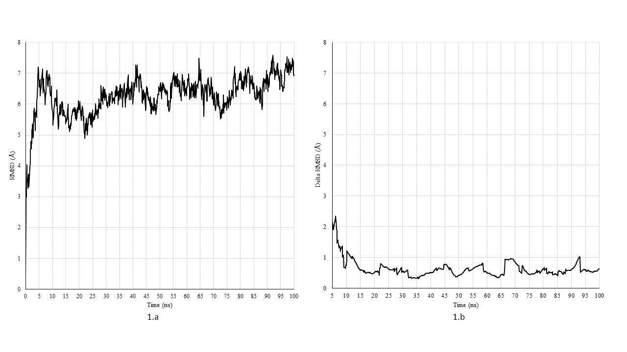 Fig. 1: a RMSD (Å) vs. Time (ns) graph, 1. b. Delta RMSD (Å) vs. Time (ns) graph