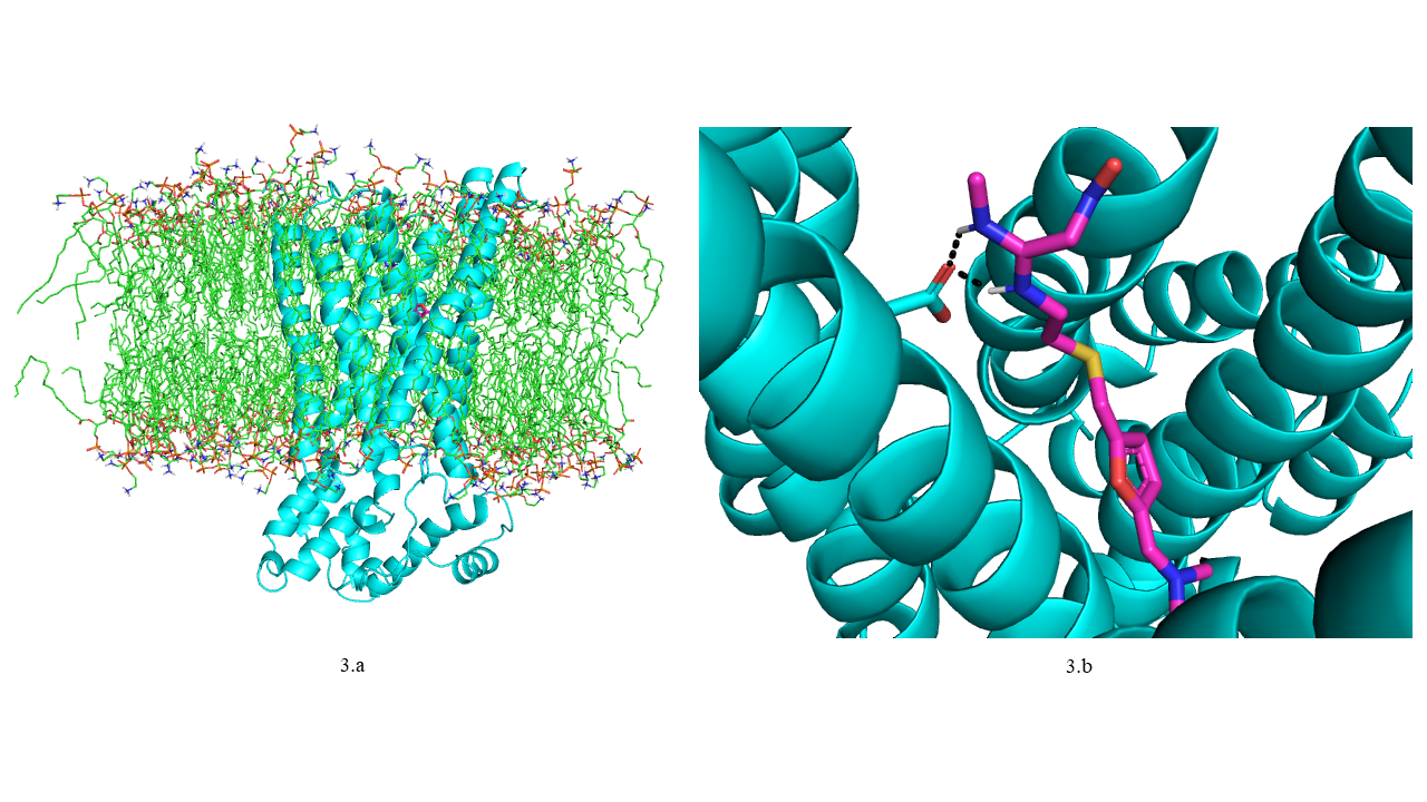Molecular dynamics (MD) simulations of the complex embedded in the membrane were then carried out to obtain an overview of the most stable ligand-receptor bond pose [16], were run with YASARA-Structure by employing the md_runmembrane.mcr command which is provided default by YASARA-Structure. The MD simulations were carried out with the following settings: The force field AMBER14, pH 7.4, temperature 298K, pressure 1 bar. Simulations were run at up to 100 ns, and simulation snapshots were stored at 100 ps intervals. The snapshots were then analyzed to examine the structural stability and the free energy of binding.