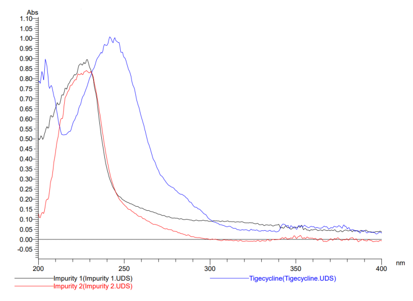 Fig. 2: UV-Visible spectrum of tigecycline and impurities (1 and 2)
