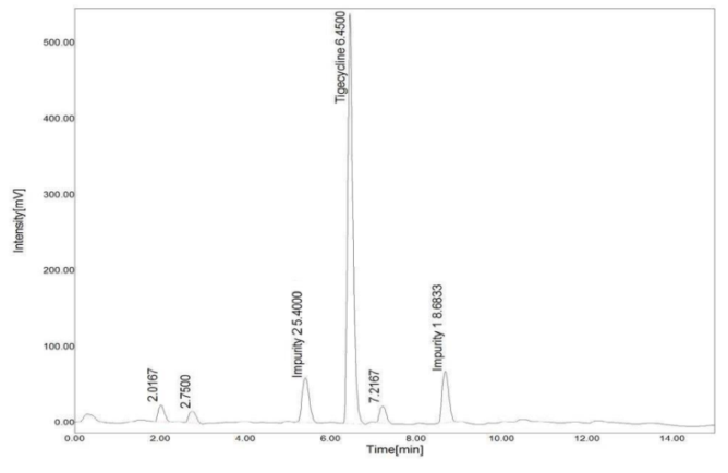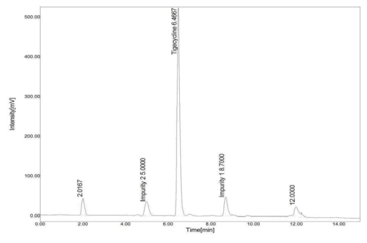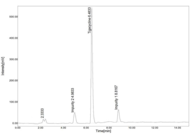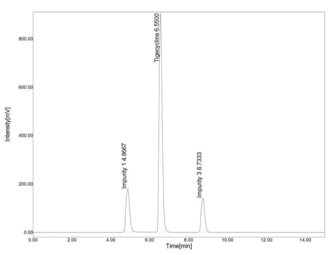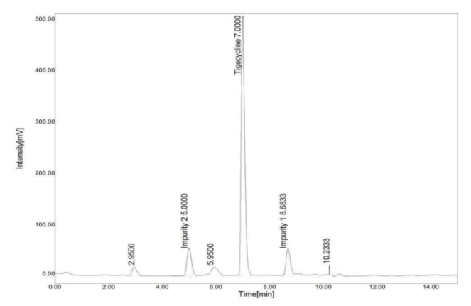Fig. 4: Optimized chromatogram of tigecycline, impurity 1 and 2