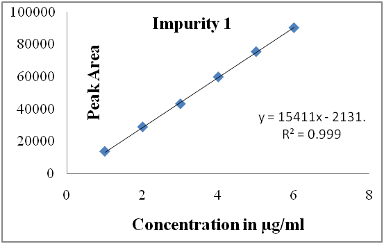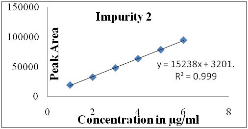 The linearity of tigecycline and its impurities (imp-1and 2 and) were estimated with ranging from 75–450 µg/ml for Tigecycline and 1–6 µg/ml for both impurity 2 and 1. The R2 value is greater than 0.999 (fig. 7) for both tigecycline and its impurities. Which gives information about the linearity of the method. These data are shown in table 5. Linearity range (µg/ml) is wider in the present study (75–450) compared to the reports of De Silva et al. (40–100) Suneetha et al. (80 to 120) Mohan et al. 2017 (0.05-0.13) Zorpas et al. (0.021-3.15) [8, 9, 12 and 14].