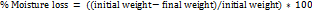 The percentage moisture loss studies were carried to check the film's physical stability. Initially weighed films of predetermined size (3×3 cm2) were placed in a desiccator containing anhydrous calcium chloride for three days. The films were removed and weighed again to calculate the percentage moisture loss by using the following formula [21].