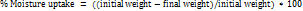 The weighted films were kept in a desiccator at room temperature for 24h. The films were collected and exposed to 84% relative humidity using a saturated solution of potassium chloride in desiccators until a constant weight was achieved. The % moisture uptake was calculated by using the formula [22]