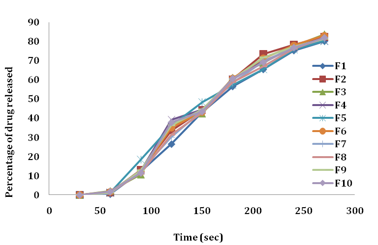 The disintegration time of the films was measured by using a disintegration rate testing apparatus. The data revealed that all the films were disintegrated within the time range of 27.3-69.8 sec. It indicated that all the films disintegrated very quickly. Drug Content of all the films was measured by standard assay method by taking 10 individual samples as per the test procedure. A film of size 2×2 cm2was cut and kept in 100 ml of the volumetric flask containing solvent. This was then shaken in a mechanical shaker till it was dissolved to get a homogeneous solution and then filtered. The drug content was determined spectroscopically after appropriate dilution of the sample by measuring the absorbance at 221 nm. The drug release study of the films was carried out by using a paddle-type dissolution rate testing apparatus. The drug release study was carried out at 50 rpm for a period of 5 min. The release data from the films revealed that the release was in an immediate manner. The dissolution profile of all the formulations was depicted in fig. 3.