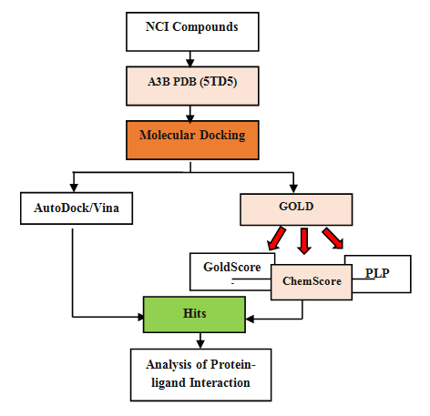 Molecular docking (MD) was performed against small compounds obtained from the DTP compound databases into the A3B active site pocket. The schematic diagram of the study is illustrated in fig. 1.
