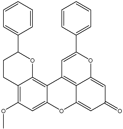 The anticancer activities of these compounds have been mentioned elsewhere. Nordacorubin can be found in the fruit part of Daemonorops draco, commonly known as dragon-blood palm. The name "Dragon's blood" refers to a reddish resinous product of the plant. The plant extract has been widely used as a traditional medicine in many cultures as a hemostatic, antidiarrheic, anticancer, anti-inflammatory, and wound healing agent [22]. Diverge range of secondary metabolites have been identified and isolated from the reddish resin, including flavones, flavanes, homoisoflavanones, chalcones, dihydrochalcones, stilbenes, and flavonoid oligomers [23-25]. Nordracorubin is derived from the dimerization of monomeric flavonoids within the plant [26]. The compound has mild antimicrobial and antiplatelet properties. This compound's derivatives, especially Dracorhodin perchlorate (DP), a synthetic analogue of Dracorhodin, demonstrated tremendous antiproliferation activity against human prostate cancer, melanoma, and leukaemia cancer cells [27, 28]. The apoptotic activities of DP on several human cancer cells, especially HeLa and MCF-7 cells, are also reported [29, 30]. Despite the wide usage of Daemonorops draco, little research has been done on the biological effects of other active compounds from Dragon's blood.