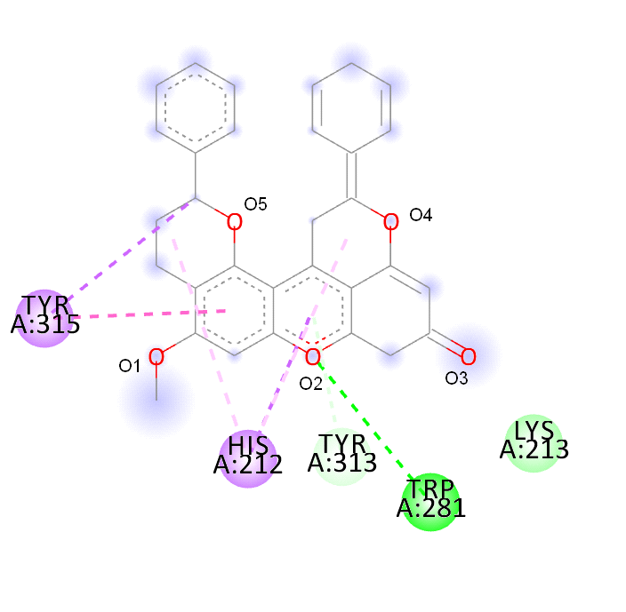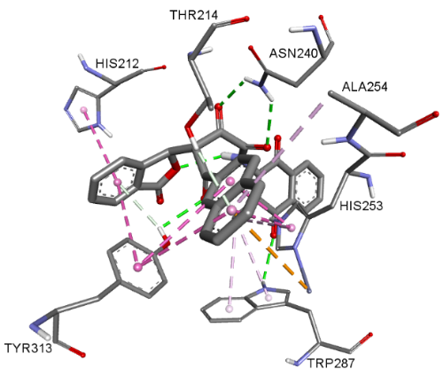 Nordracorubin formed a conventional hydrogen bond with Trp281 at O2 and π-donor hydrogen bond with Tyr313 (fig. 4i.). Hydrophobic π-sigma interaction occurred between aromatic rings of the compound with Tyr315 and His212. Besides that, π-π stacked and π-alkyl with these residues were also identified. The H-bond and π-sigma interaction significantly enhanced the enzyme-substrate complex's stability [21].