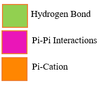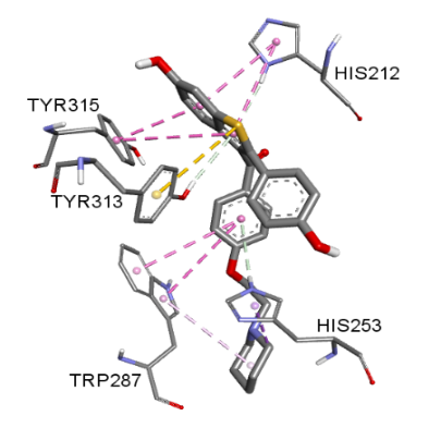 On the other hand, the aromatic rings of compound RAL made a hydrophobic π-π stacking interaction with Tyr315, π-sigma with His253, and T-shaped π-stacking with Trp287 and His212 (fig. 4iii). H-bond interactions of the NH with Tyr313, His212, and His253 were also observed. Consequently, π-sulfur interaction was seen between the aromatic ring attaching to Tyr313 and the sulfur atom's lone pair of electrons. Besides, π-alkyl interaction was observed between the alkyl group of A3B and the aromatic ring of the compound bonding with Trp287.