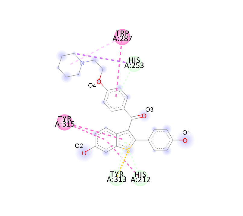 | Raloxifene hydrochloride | 747,974 | Approved Oncology Drugs Set IV | C28H27NO4S | His212, His253, Trp287, Tyr313, Tyr315 | 30.0083 | 37.5152 |