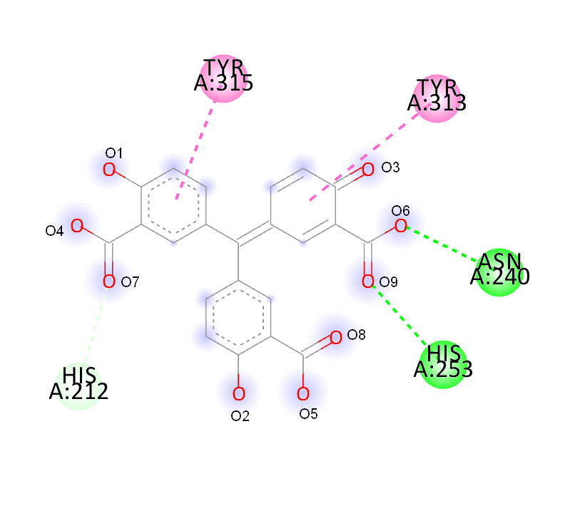 | Aurintri-carboxylic Acid (ATA) | 4056 | - | C22H14O9 | Asn240, His212, His253, Tyr313, Tyr315 | 47.512 | 32.934 |
