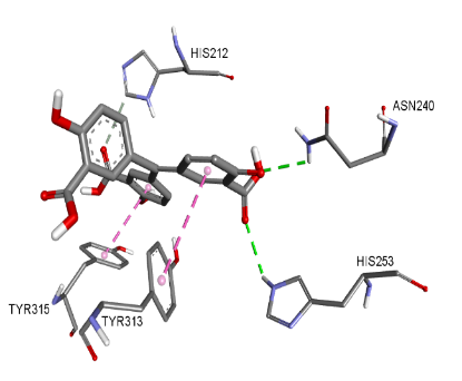 ATA formed a hydrophobic π-π stacking interaction with Tyr315. The aromatic ring established T-shaped π-stacking with Tyr313. A conventional hydrogen bonding interaction with side chain residues of Asn240 and His253 at oxygen atoms in the ortho position was observed. These binding modes indicated the stability of the compounds to interact well within the receptor (fig. 4iv).
