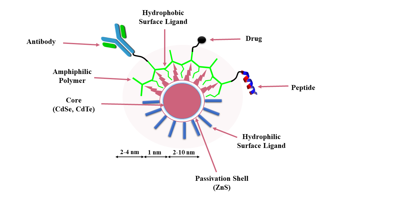 Further approaches employ phospholipids for modification or hydrophobic interactions between the QDs and amphiphilic polymers or encapsulate the QDs in a silica shell. Numerous potential outcomes are there in which biomolecules can be attached to the QDs. The utilization of QDs containing streptavidin is typically utilized because it is easy to link them to biotin-tagged biomolecules [99, 100]. Numerous strategies can be used to get QDs bio-conjugation consisting of covalent bond formation, multivalent chelation, or passive adsorption. There are two famous cross-linking reactions; active ester maleimide mediated amine, sulfhydryl coupling, and carbodiimide mediated amide formation. The bio-conjugation also determines by the hydrophilic coating as the required functional groups deliver by it and should be considered [101–103].