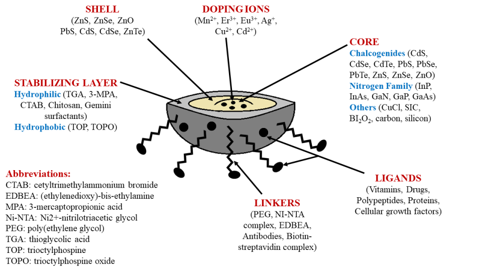 QDs core consists of several substances like cadmium, zinc, lead chalcogenides (CdS, CdSe, CdTe), copper salt (CuCl), arsenides (InAs, GaAs), semiconducting phosphides (InP, GaP), and nitrides (GaN). The shell of CdSe, ZnSe, PbS, ZnS, ZnTe, CdS, ZnO generally enclosed the core [3]. The core of nanomaterials guarded by outer covering from photoinitiated degradation and removing surface defects enhances the luminescence properties. Besides, cadmium, silver, copper, manganese, and rare earth metal ions can be used to dope the core of nanocrystals to enhance photoluminescence properties [25, 26]. QDs can be assembled, permitting particle shape, size, and chemical composition to be changed by suit a given application. The design and size of QDs are the properties that are frequently manipulated; this will decide if the QDs are chemically excited in NIR or UV light [27–29]. The biological targeting molecules (e. g., antibodies) or biocompatible polymeric materials (e. g., PEG) can be functionalized on the amenable external surface of QDs to improve their physiological system performance. The most commonly utilized QDs consist of graphene QDs, carbon QDs, and cadmium-based QDs [30–32]. QDs are found to be photochemically stable with symmetric, narrow, and strong fluorescence emission. QDs are perfectly suitable for repetitive measurements or long-term observations [33–35]. After intradermal administration of dots in mouse paw, the near IR emitting dots might be noticed in the intraoperative imaging system's lymphatic system [36–39]. A report proposed that probes of quantum rods conjugated with transferring were productive for in vitro blood-brain barrier transmigration [40–43]. In fig. 2 composition of QDs is mentioned along with the material used [44]. The QDs are metastable and generally, through chemical surface modification, need to be stabilized. QDs show narrow-size tunable emission spectra, high extinction coefficients, and much diminishing photobleaching rates compared to organic dyes [45–48].