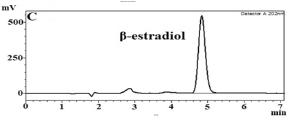 The stability of FP and SX methanolic solutions in acidic/basic/oxidative conditions was tested by taking 5 ml of 1 M HCl (for acidic condition stability test) or 1 M NaOH (for basic condition stability test) or (30 % H2O2 oxidative condition stability test) in 10 ml volumetric flask then spiked the analyte into the HCl, NaOH or 30 % H2O2 solutions to get the exact QC solution concentration. The QC samples were kept in the 37 ᵒC water bath for 3 h. Then, the QC samples were neutralized with 5 M NaOH (for acidic condition stability test)/HCl for basic condition stability test) to pH 7. The flasks were filled with methanol to obtain the following concentrations (80, 53.33, 0.67, and 0.2 µg/ml) and (40, 26.67, 0.33, and 0.1 µg/ml) of FP and SX, respectively, for acidic, basic, or oxidative conditions stability test. For each quality control sample, a volume of 0.5 ml of each of FP, SX, and βE as internal standard was withdrawn and mixed into a separate vial and injected in the HPLC with calibration curve’s standards.