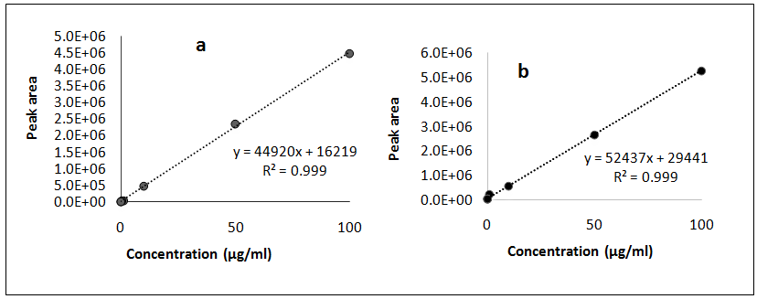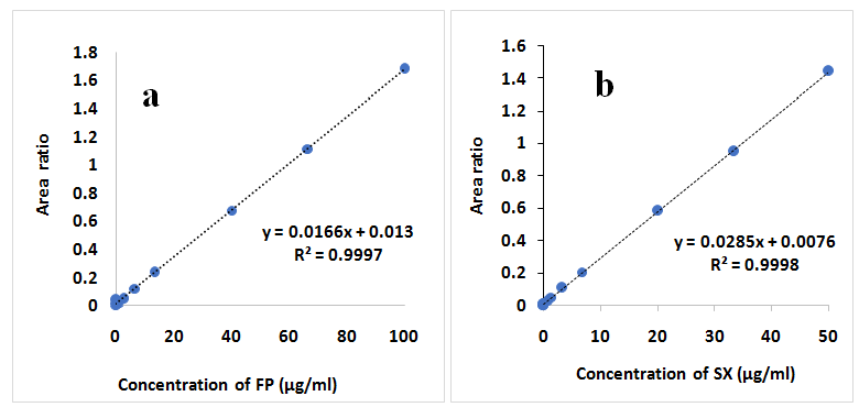 Fig. 3: Calibration curve for the concentration with the peak area of FP (a) and SX (b)
