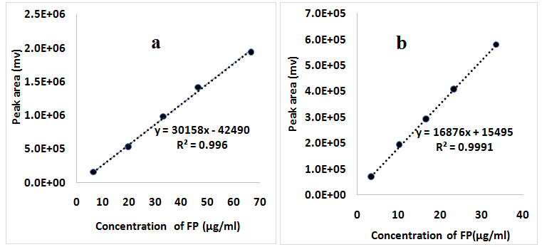 Three calibration curves with the following concentrations points (6.67-66.67 µg/ml) and (3.33-33.3 µg/ml) for FP and SX, respectively, were extracted from spiked plasma and injected into the HPLC three times. The calibration graphs for FP and SX are in (fig. 7).