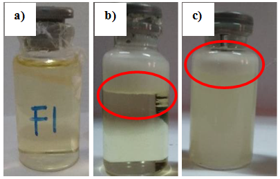 Fig. 1: The observation result of nanoemulsion preparations based on variation of surfactant concentrations. (a) 30%; (b) 25%; (c) 15%