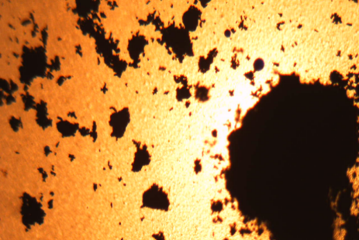 The emulsion type was carried out under an optical microscope (fig. 2) at a magnification of 1 x 0.7. The resulting image shows that the emulsion type is oil in water (O/W). The O/W type is marked with the methylene blue evenly distributed in nanoemulsion. Meanwhile, if there are only spots, that is confirmed that the nanoemulsion type is water in oil (W/O) [1]. Particle size determination is one of the factors that will affect the absorption of a drug through the skin. The smaller the particle size, the easier the drug will penetrate the skin layer [15]. Based on Table-2, bromelain addition in the nanoemulsion caused the particle size to increase. However, it is still in the allowed range of nanoemulsion characteristics (<100 nm) [16]. Nanoemulsion with a protein substance can increase its particle size [7], which might be due to the macromolecular protein size. The nanoemulsion stability also could be seen from the polydispersity index value (pdI). The polydispersity index range is between 0 and 1. If the number closes to 0, it indicates a homogeneous dispersion, while a value of more than 0.5 indicates high heterogeneity [17]. Based on Table-2, the nanoemulsion value without the addition of bromelain was around 0.099. Meanwhile, the addition of bromelain increased the pdI value to 0.323. The addition of active substances to the nanoemulsion system causes the homogeneity to decrease. However, the pdI value is still in the allowed range so that the nanoemulsion has stable and homogeneous characteristics.