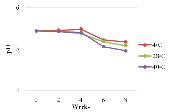 Fig. 4: pH of nanoemulsion for 8 w at different temperatures. All values are expressed as mean±SD (n=3)