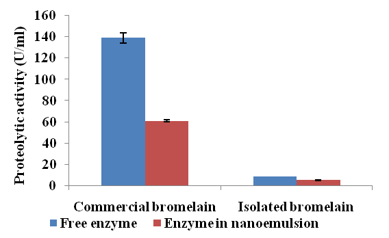 Conclusion: The results showed promise for bromelain loaded into nanoemulsion as a vehicle for topically administered therapeutic enzymes.