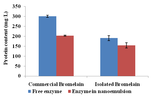 Fig. 6: The protein content of bromelain (mg/l). Data represented as mean±SD (n=3)