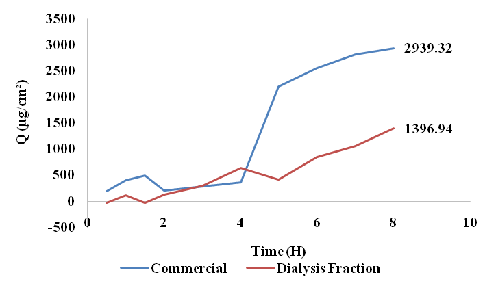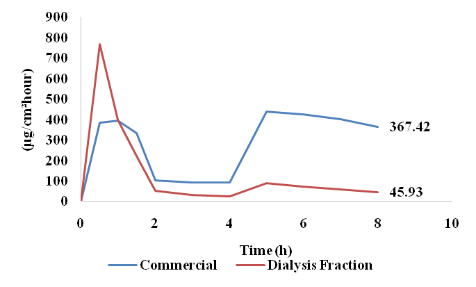 Based on fig. 8, the flux trend of the isolated bromelain from the first phase showed a higher speed than commercial bromelain. This condition occurs because the isolated bromelain has a more dilute form within the base than commercial bromelain, so that drug diffusion was faster. Besides, commercial bromelain in the first phase is found in the lowest skin layer and has not been completely dissolved in the receptor compartment, so that the diffusion speed is low. However, the penetration rate of commercial enzymes showed a higher value at the next time interval because the enzyme had been dissolved, which was proved by the absorbance increases. The pressure from continuous bromelain released from the donor compartment pushes the bromelain in the skin pores to enter the receptor fluid. When the isolated bromelain decreases or the speed is not significantly changed, it is called the steady-state or saturated condition.