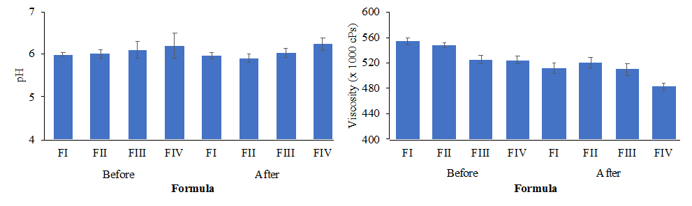 Fig. 1: The comparison of (left) pH and (right) viscosity of AV powder gel before and after sterilization (The results were calculated as mean±standard deviation; n=3)