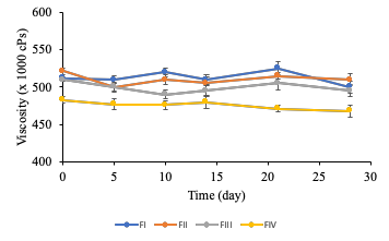 Fig. 3: The viscosity of AV powder gel after 28 storage days (The results were calculated as mean±standard deviation; n=3)