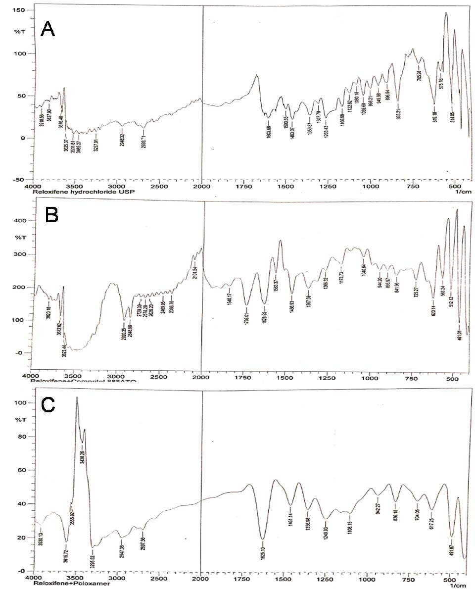 The drug-excipients compatibility study was evaluated using FTIR spectroscopy and DSC. The FTIR spectrum of RLX showed characteristic peaks at 3465.27 cm-1 (O-H stretching), 2938.42 cm-1 (Aromatic C-H bond), 1603.88 cm-1 (C=O stretching), 1500.68 cm-1 (Aromatic C=C), 1463.07 cm-1 (–S–benzothiophene), 1263.43 cm-1 (phenolic C-O stretch) and 1039.68 cm-1 (ether C-O-C stretch) (fig. 1(A)). These characteristic peaks are also visible in the physical mixture of RLX and Compritol 888 ATO, and RLX and P407 (fig. 1 (B and C)
