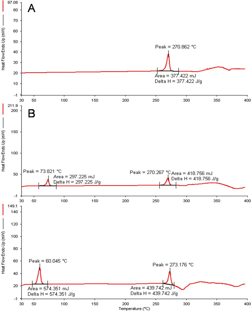 Fig. 2: Thermograph of (A) RLX, (B) RLX+RLX+Compritol 888 ATO and (C) RLX+P407