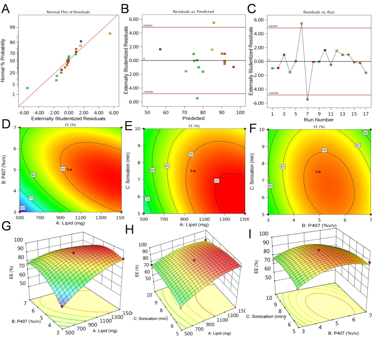 Fig. 5: Effect of variables on entrapment efficiency. (A) The normal plot of residuals, (B) residual vs predicted plot, (C) residual vs run, (D-F) 2D contour plots, and (G-I) response surface 3D plots
